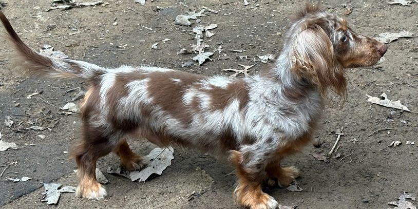 Bois a sweet playful guy. He is a chocolate and tan long hair dapple. He is producing some really beautiful and loving puppies for me. He is tiny, only about 9 lbs. I'm expecting to have him produce beautiful solids and dapples that are on the smaller side. He has produced some wonderful puppies and is getting to retirement age and will move on soon as many of my girls are from him. He is still able to be a Dad, just is related to too many of my gals. My kennel makes our own girls. We bring in boys for genetic diversity...